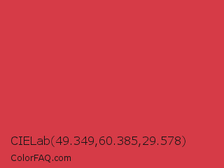 CIELab 49.349,60.385,29.578 Color is a normal red color and the nearest color is Jasper #d73b3e. Hex code #d63b47 and RGB value is rgb(214,59,71). In RGB color space, this color is composed of 84% red, 23% green, 28% blue, In CMYK color space, this color is composed of 0% cyan, 72% magenta, 67% yellow , 16% black , In HSL color space, this color has a hue angle of 355° , 65% saturation and 54% lightness.