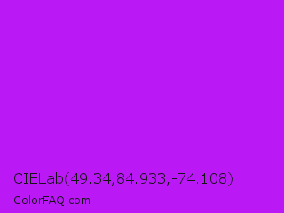 CIELab 49.34,84.933,-74.108 Color is a normal purple color and the nearest color is Vivid Mulberry #b80ce3. Hex code #bb18f6 and RGB value is rgb(187,24,246). In RGB color space, this color is composed of 73% red, 9% green, 96% blue, In CMYK color space, this color is composed of 24% cyan, 90% magenta, 0% yellow , 4% black , In HSL color space, this color has a hue angle of 284° , 93% saturation and 53% lightness.