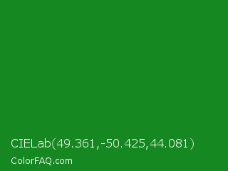 CIELab 49.361,-50.425,44.081 Color is a normal green color and the nearest color is Forest Green #228b22. Hex code #168821 and RGB value is rgb(22,136,33). In RGB color space, this color is composed of 9% red, 53% green, 13% blue, In CMYK color space, this color is composed of 84% cyan, 0% magenta, 76% yellow , 47% black , In HSL color space, this color has a hue angle of 126° , 72% saturation and 31% lightness.