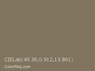 CIELab 49.36,0.912,13.861 Color is a normal orange color and the nearest color is Sand Dune #826f65. Hex code #80745e and RGB value is rgb(128,116,94). In RGB color space, this color is composed of 50% red, 45% green, 37% blue, In CMYK color space, this color is composed of 0% cyan, 9% magenta, 27% yellow , 50% black , In HSL color space, this color has a hue angle of 39° , 15% saturation and 44% lightness.