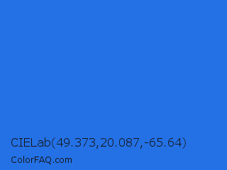 CIELab 49.373,20.087,-65.64 Color is a normal blue color and the nearest color is Bright Navy Blue #1974d2. Hex code #2471e6 and RGB value is rgb(36,113,230). In RGB color space, this color is composed of 14% red, 44% green, 90% blue, In CMYK color space, this color is composed of 84% cyan, 51% magenta, 0% yellow , 10% black , In HSL color space, this color has a hue angle of 216° , 80% saturation and 52% lightness.