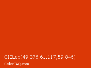 CIELab 49.376,61.117,59.846 Color is a normal red color and the nearest color is Grenadier #d54600. Hex code #db3806 and RGB value is rgb(219,56,6). In RGB color space, this color is composed of 86% red, 22% green, 2% blue, In CMYK color space, this color is composed of 0% cyan, 74% magenta, 97% yellow , 14% black , In HSL color space, this color has a hue angle of 14° , 95% saturation and 44% lightness.