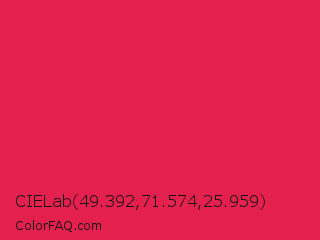 CIELab 49.392,71.574,25.959 Color is a normal red color and the nearest color is Spanish Crimson #e51a4c. Hex code #e3204e and RGB value is rgb(227,32,78). In RGB color space, this color is composed of 89% red, 13% green, 31% blue, In CMYK color space, this color is composed of 0% cyan, 86% magenta, 66% yellow , 11% black , In HSL color space, this color has a hue angle of 346° , 78% saturation and 51% lightness.