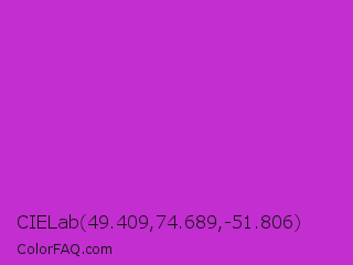 CIELab 49.409,74.689,-51.806 Color is a normal magenta color and the nearest color is Steel Pink #cc33cc. Hex code #c22ecf and RGB value is rgb(194,46,207). In RGB color space, this color is composed of 76% red, 18% green, 81% blue, In CMYK color space, this color is composed of 6% cyan, 78% magenta, 0% yellow , 19% black , In HSL color space, this color has a hue angle of 295° , 64% saturation and 50% lightness.