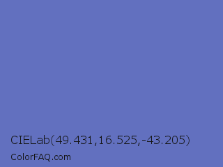 CIELab 49.431,16.525,-43.205 Color is a normal blue color and the nearest color is Toolbox #746cc0. Hex code #6270bf and RGB value is rgb(98,112,191). In RGB color space, this color is composed of 38% red, 44% green, 75% blue, In CMYK color space, this color is composed of 49% cyan, 41% magenta, 0% yellow , 25% black , In HSL color space, this color has a hue angle of 231° , 42% saturation and 57% lightness.