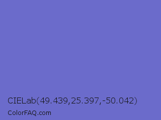 CIELab 49.439,25.397,-50.042 Color is a light blue color and the nearest color is Blue Marguerite #7666c6. Hex code #6b6bcb and RGB value is rgb(107,107,203). In RGB color space, this color is composed of 42% red, 42% green, 80% blue, In CMYK color space, this color is composed of 47% cyan, 47% magenta, 0% yellow , 20% black , In HSL color space, this color has a hue angle of 240° , 48% saturation and 61% lightness.