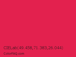 CIELab 49.458,71.383,26.044 Color is a normal red color and the nearest color is Spanish Crimson #e51a4c. Hex code #e3214e and RGB value is rgb(227,33,78). In RGB color space, this color is composed of 89% red, 13% green, 31% blue, In CMYK color space, this color is composed of 0% cyan, 85% magenta, 66% yellow , 11% black , In HSL color space, this color has a hue angle of 346° , 78% saturation and 51% lightness.