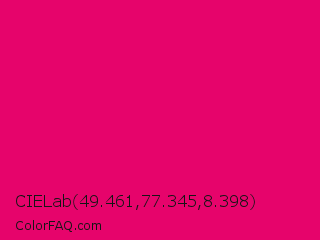CIELab 49.461,77.345,8.398 Color is a normal rose color and the nearest color is Red Purple #e40078. Hex code #e6046b and RGB value is rgb(230,4,107). In RGB color space, this color is composed of 90% red, 2% green, 42% blue, In CMYK color space, this color is composed of 0% cyan, 98% magenta, 53% yellow , 10% black , In HSL color space, this color has a hue angle of 333° , 97% saturation and 46% lightness.