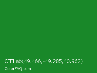 CIELab 49.466,-49.285,40.962 Color is a normal green color and the nearest color is Forest Green #228b22. Hex code #198829 and RGB value is rgb(25,136,41). In RGB color space, this color is composed of 10% red, 53% green, 16% blue, In CMYK color space, this color is composed of 82% cyan, 0% magenta, 70% yellow , 47% black , In HSL color space, this color has a hue angle of 129° , 69% saturation and 32% lightness.