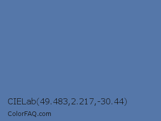 CIELab 49.483,2.217,-30.44 Color is a normal blue color and the nearest color is Blue Yonder #5072a7. Hex code #5577a9 and RGB value is rgb(85,119,169). In RGB color space, this color is composed of 33% red, 47% green, 66% blue, In CMYK color space, this color is composed of 50% cyan, 30% magenta, 0% yellow , 34% black , In HSL color space, this color has a hue angle of 216° , 33% saturation and 50% lightness.