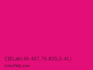 CIELab 49.497,76.835,0.41 Color is a normal rose color and the nearest color is Red Purple #e40078. Hex code #e30e78 and RGB value is rgb(227,14,120). In RGB color space, this color is composed of 89% red, 5% green, 47% blue, In CMYK color space, this color is composed of 0% cyan, 94% magenta, 47% yellow , 11% black , In HSL color space, this color has a hue angle of 330° , 88% saturation and 47% lightness.