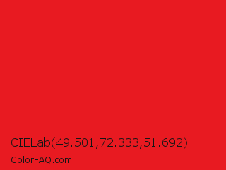 CIELab 49.501,72.333,51.692 Color is a normal red color and the nearest color is Red Pigment #ed1c24. Hex code #e81a21 and RGB value is rgb(232,26,33). In RGB color space, this color is composed of 91% red, 10% green, 13% blue, In CMYK color space, this color is composed of 0% cyan, 89% magenta, 86% yellow , 9% black , In HSL color space, this color has a hue angle of 358° , 82% saturation and 51% lightness.