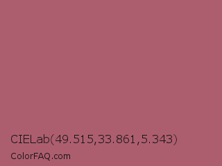 CIELab 49.515,33.861,5.343 Color is a normal red color and the nearest color is Deep Puce #a95c68. Hex code #ad5e6e and RGB value is rgb(173,94,110). In RGB color space, this color is composed of 68% red, 37% green, 43% blue, In CMYK color space, this color is composed of 0% cyan, 46% magenta, 36% yellow , 32% black , In HSL color space, this color has a hue angle of 348° , 33% saturation and 52% lightness.