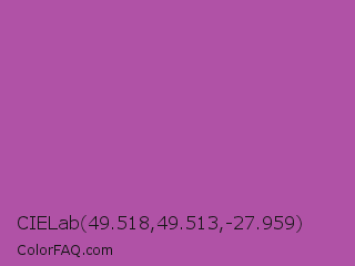 CIELab 49.518,49.513,-27.959 Color is a normal magenta color and the nearest color is Pearly Purple #b768a2. Hex code #b052a6 and RGB value is rgb(176,82,166). In RGB color space, this color is composed of 69% red, 32% green, 65% blue, In CMYK color space, this color is composed of 0% cyan, 53% magenta, 6% yellow , 31% black , In HSL color space, this color has a hue angle of 306° , 37% saturation and 51% lightness.