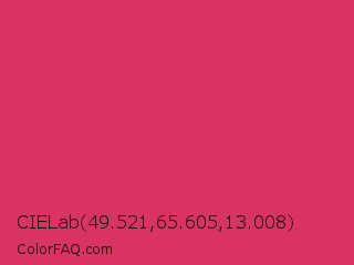 CIELab 49.521,65.605,13.008 Color is a normal rose color and the nearest color is Cerise Red #de3163. Hex code #d93363 and RGB value is rgb(217,51,99). In RGB color space, this color is composed of 85% red, 20% green, 39% blue, In CMYK color space, this color is composed of 0% cyan, 76% magenta, 54% yellow , 15% black , In HSL color space, this color has a hue angle of 343° , 69% saturation and 53% lightness.