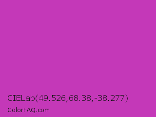 CIELab 49.526,68.38,-38.277 Color is a normal magenta color and the nearest color is Byzantine #bd33a4. Hex code #c438b8 and RGB value is rgb(196,56,184). In RGB color space, this color is composed of 77% red, 22% green, 72% blue, In CMYK color space, this color is composed of 0% cyan, 71% magenta, 6% yellow , 23% black , In HSL color space, this color has a hue angle of 305° , 56% saturation and 49% lightness.