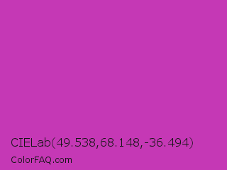 CIELab 49.538,68.148,-36.494 Color is a normal magenta color and the nearest color is Byzantine #bd33a4. Hex code #c538b5 and RGB value is rgb(197,56,181). In RGB color space, this color is composed of 77% red, 22% green, 71% blue, In CMYK color space, this color is composed of 0% cyan, 72% magenta, 8% yellow , 23% black , In HSL color space, this color has a hue angle of 307° , 56% saturation and 50% lightness.