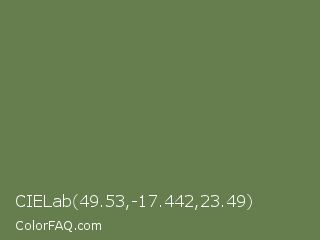 CIELab 49.53,-17.442,23.49 Color is a normal green color and the nearest color is Dingley #5d7747. Hex code #667d4d and RGB value is rgb(102,125,77). In RGB color space, this color is composed of 40% red, 49% green, 30% blue, In CMYK color space, this color is composed of 18% cyan, 0% magenta, 38% yellow , 51% black , In HSL color space, this color has a hue angle of 89° , 24% saturation and 40% lightness.
