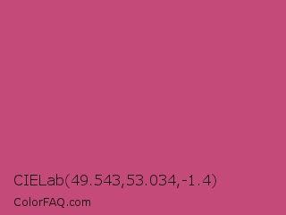 CIELab 49.543,53.034,-1.4 Color is a normal rose color and the nearest color is Fuchsia Rose #c74375. Hex code #c44a7a and RGB value is rgb(196,74,122). In RGB color space, this color is composed of 77% red, 29% green, 48% blue, In CMYK color space, this color is composed of 0% cyan, 62% magenta, 38% yellow , 23% black , In HSL color space, this color has a hue angle of 336° , 51% saturation and 53% lightness.