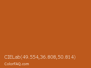 CIELab 49.554,36.808,50.814 Color is a normal orange color and the nearest color is Orange Roughy #c45719. Hex code #bd591c and RGB value is rgb(189,89,28). In RGB color space, this color is composed of 74% red, 35% green, 11% blue, In CMYK color space, this color is composed of 0% cyan, 53% magenta, 85% yellow , 26% black , In HSL color space, this color has a hue angle of 23° , 74% saturation and 43% lightness.