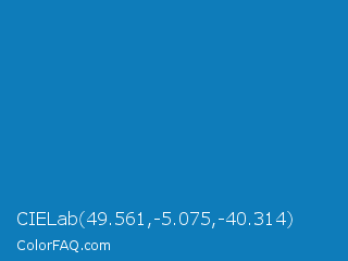 CIELab 49.561,-5.075,-40.314 Color is a normal blue color and the nearest color is Star Command Blue #007bb8. Hex code #0e7cba and RGB value is rgb(14,124,186). In RGB color space, this color is composed of 5% red, 49% green, 73% blue, In CMYK color space, this color is composed of 92% cyan, 33% magenta, 0% yellow , 27% black , In HSL color space, this color has a hue angle of 202° , 86% saturation and 39% lightness.