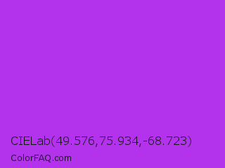 CIELab 49.576,75.934,-68.723 Color is a normal purple color and the nearest color is Veronica #a020f0. Hex code #b333ed and RGB value is rgb(179,51,237). In RGB color space, this color is composed of 70% red, 20% green, 93% blue, In CMYK color space, this color is composed of 24% cyan, 78% magenta, 0% yellow , 7% black , In HSL color space, this color has a hue angle of 281° , 84% saturation and 56% lightness.