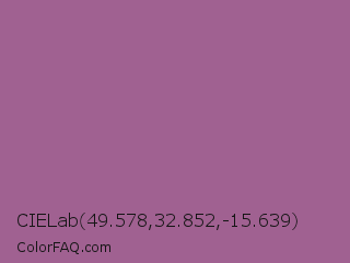 CIELab 49.578,32.852,-15.639 Color is a normal magenta color and the nearest color is Strikemaster #956387. Hex code #a06191 and RGB value is rgb(160,97,145). In RGB color space, this color is composed of 63% red, 38% green, 57% blue, In CMYK color space, this color is composed of 0% cyan, 39% magenta, 9% yellow , 37% black , In HSL color space, this color has a hue angle of 314° , 25% saturation and 50% lightness.
