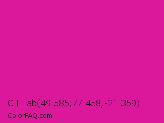 CIELab 49.585,77.458,-21.359 Color is a normal magenta color and the nearest color is Barbie Pink #e0218a. Hex code #db179c and RGB value is rgb(219,23,156). In RGB color space, this color is composed of 86% red, 9% green, 61% blue, In CMYK color space, this color is composed of 0% cyan, 89% magenta, 29% yellow , 14% black , In HSL color space, this color has a hue angle of 319° , 81% saturation and 47% lightness.