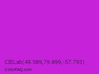 CIELab 49.589,79.899,-57.793 Color is a normal magenta color and the nearest color is Steel Pink #cc33cc. Hex code #c522da and RGB value is rgb(197,34,218). In RGB color space, this color is composed of 77% red, 13% green, 85% blue, In CMYK color space, this color is composed of 10% cyan, 84% magenta, 0% yellow , 15% black , In HSL color space, this color has a hue angle of 293° , 73% saturation and 49% lightness.