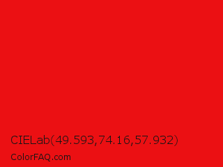 CIELab 49.593,74.16,57.932 Color is a normal red color and the nearest color is Vivid Red #f70d1a. Hex code #eb1013 and RGB value is rgb(235,16,19). In RGB color space, this color is composed of 92% red, 6% green, 7% blue, In CMYK color space, this color is composed of 0% cyan, 93% magenta, 92% yellow , 8% black , In HSL color space, this color has a hue angle of 359° , 87% saturation and 49% lightness.