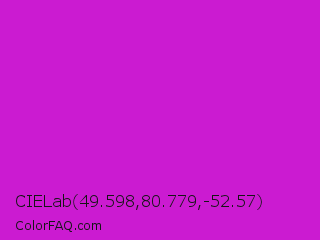 CIELab 49.598,80.779,-52.57 Color is a normal magenta color and the nearest color is Steel Pink #cc33cc. Hex code #cb1bd1 and RGB value is rgb(203,27,209). In RGB color space, this color is composed of 80% red, 11% green, 82% blue, In CMYK color space, this color is composed of 3% cyan, 87% magenta, 0% yellow , 18% black , In HSL color space, this color has a hue angle of 298° , 77% saturation and 46% lightness.