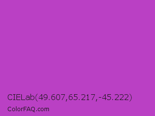 CIELab 49.607,65.217,-45.222 Color is a normal magenta color and the nearest color is Fuchsia Pink #c154c1. Hex code #ba40c4 and RGB value is rgb(186,64,196). In RGB color space, this color is composed of 73% red, 25% green, 77% blue, In CMYK color space, this color is composed of 5% cyan, 67% magenta, 0% yellow , 23% black , In HSL color space, this color has a hue angle of 295° , 53% saturation and 51% lightness.