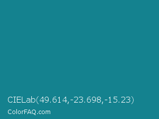 CIELab 49.614,-23.698,-15.23 Color is a normal cyan color and the nearest color is Blue Chill #0c8990. Hex code #14828f and RGB value is rgb(20,130,143). In RGB color space, this color is composed of 8% red, 51% green, 56% blue, In CMYK color space, this color is composed of 86% cyan, 9% magenta, 0% yellow , 44% black , In HSL color space, this color has a hue angle of 186° , 75% saturation and 32% lightness.