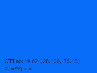 CIELab 49.624,28.406,-76.43 Color is a normal blue color and the nearest color is Brandeis Blue #0070ff. Hex code #086efa and RGB value is rgb(8,110,250). In RGB color space, this color is composed of 3% red, 43% green, 98% blue, In CMYK color space, this color is composed of 97% cyan, 56% magenta, 0% yellow , 2% black , In HSL color space, this color has a hue angle of 215° , 96% saturation and 51% lightness.