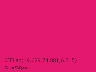 CIELab 49.629,74.881,6.715 Color is a normal rose color and the nearest color is Razzmatazz #e3256b. Hex code #e3186e and RGB value is rgb(227,24,110). In RGB color space, this color is composed of 89% red, 9% green, 43% blue, In CMYK color space, this color is composed of 0% cyan, 89% magenta, 52% yellow , 11% black , In HSL color space, this color has a hue angle of 335° , 81% saturation and 49% lightness.