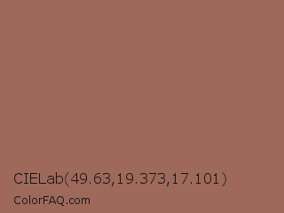 CIELab 49.63,19.373,17.101 Color is a normal red color and the nearest color is Dark Chestnut #986960. Hex code #9e695a and RGB value is rgb(158,105,90). In RGB color space, this color is composed of 62% red, 41% green, 35% blue, In CMYK color space, this color is composed of 0% cyan, 34% magenta, 43% yellow , 38% black , In HSL color space, this color has a hue angle of 13° , 27% saturation and 49% lightness.