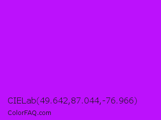 CIELab 49.642,87.044,-76.966 Color is a normal purple color and the nearest color is Electric Purple #bf00ff. Hex code #bc11fc and RGB value is rgb(188,17,252). In RGB color space, this color is composed of 74% red, 7% green, 99% blue, In CMYK color space, this color is composed of 25% cyan, 93% magenta, 0% yellow , 1% black , In HSL color space, this color has a hue angle of 284° , 98% saturation and 53% lightness.