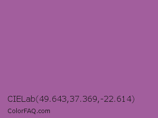 CIELab 49.643,37.369,-22.614 Color is a normal magenta color and the nearest color is Pearly Purple #b768a2. Hex code #a25e9d and RGB value is rgb(162,94,157). In RGB color space, this color is composed of 64% red, 37% green, 62% blue, In CMYK color space, this color is composed of 0% cyan, 42% magenta, 3% yellow , 36% black , In HSL color space, this color has a hue angle of 304° , 27% saturation and 50% lightness.