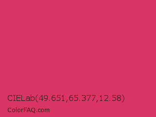 CIELab 49.651,65.377,12.58 Color is a normal rose color and the nearest color is Cerise Red #de3163. Hex code #d93464 and RGB value is rgb(217,52,100). In RGB color space, this color is composed of 85% red, 20% green, 39% blue, In CMYK color space, this color is composed of 0% cyan, 76% magenta, 54% yellow , 15% black , In HSL color space, this color has a hue angle of 343° , 68% saturation and 53% lightness.