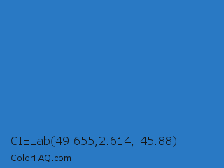 CIELab 49.655,2.614,-45.88 Color is a normal blue color and the nearest color is Mariner #286acd. Hex code #2979c4 and RGB value is rgb(41,121,196). In RGB color space, this color is composed of 16% red, 47% green, 77% blue, In CMYK color space, this color is composed of 79% cyan, 38% magenta, 0% yellow , 23% black , In HSL color space, this color has a hue angle of 209° , 65% saturation and 46% lightness.