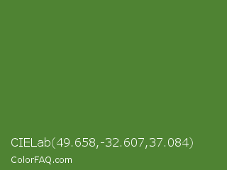 CIELab 49.658,-32.607,37.084 Color is a normal green color and the nearest color is Sap Green #507d2a. Hex code #4f8333 and RGB value is rgb(79,131,51). In RGB color space, this color is composed of 31% red, 51% green, 20% blue, In CMYK color space, this color is composed of 40% cyan, 0% magenta, 61% yellow , 49% black , In HSL color space, this color has a hue angle of 99° , 44% saturation and 36% lightness.