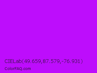 CIELab 49.659,87.579,-76.931 Color is a normal purple color and the nearest color is Electric Purple #bf00ff. Hex code #bd0dfc and RGB value is rgb(189,13,252). In RGB color space, this color is composed of 74% red, 5% green, 99% blue, In CMYK color space, this color is composed of 25% cyan, 95% magenta, 0% yellow , 1% black , In HSL color space, this color has a hue angle of 284° , 98% saturation and 52% lightness.