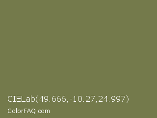 CIELab 49.666,-10.27,24.997 Color is a normal yellow color and the nearest color is Go Ben #726d4e. Hex code #747a4b and RGB value is rgb(116,122,75). In RGB color space, this color is composed of 45% red, 48% green, 29% blue, In CMYK color space, this color is composed of 5% cyan, 0% magenta, 39% yellow , 52% black , In HSL color space, this color has a hue angle of 68° , 24% saturation and 39% lightness.