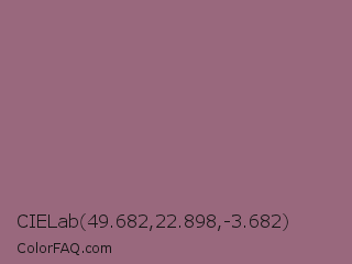 CIELab 49.682,22.898,-3.682 Color is a normal rose color and the nearest color is Strikemaster #956387. Hex code #99687d and RGB value is rgb(153,104,125). In RGB color space, this color is composed of 60% red, 41% green, 49% blue, In CMYK color space, this color is composed of 0% cyan, 32% magenta, 18% yellow , 40% black , In HSL color space, this color has a hue angle of 334° , 19% saturation and 50% lightness.