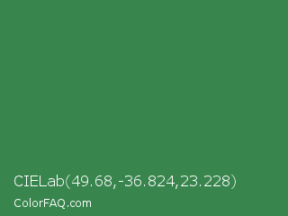 CIELab 49.68,-36.824,23.228 Color is a normal green color and the nearest color is Goblin #3d7d52. Hex code #38854d and RGB value is rgb(56,133,77). In RGB color space, this color is composed of 22% red, 52% green, 30% blue, In CMYK color space, this color is composed of 58% cyan, 0% magenta, 42% yellow , 48% black , In HSL color space, this color has a hue angle of 136° , 41% saturation and 37% lightness.