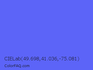CIELab 49.698,41.036,-75.081 Color is a light blue color and the nearest color is Very Light Blue #6666ff. Hex code #5c64f8 and RGB value is rgb(92,100,248). In RGB color space, this color is composed of 36% red, 39% green, 97% blue, In CMYK color space, this color is composed of 63% cyan, 60% magenta, 0% yellow , 3% black , In HSL color space, this color has a hue angle of 237° , 92% saturation and 67% lightness.