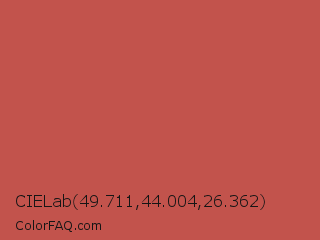 CIELab 49.711,44.004,26.362 Color is a normal red color and the nearest color is Bittersweet Shimmer #bf4f51. Hex code #c2534c and RGB value is rgb(194,83,76). In RGB color space, this color is composed of 76% red, 33% green, 30% blue, In CMYK color space, this color is composed of 0% cyan, 57% magenta, 61% yellow , 24% black , In HSL color space, this color has a hue angle of 4° , 49% saturation and 53% lightness.