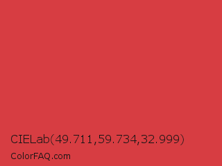 CIELab 49.711,59.734,32.999 Color is a normal red color and the nearest color is Jasper #d73b3e. Hex code #d73d42 and RGB value is rgb(215,61,66). In RGB color space, this color is composed of 84% red, 24% green, 26% blue, In CMYK color space, this color is composed of 0% cyan, 72% magenta, 69% yellow , 16% black , In HSL color space, this color has a hue angle of 358° , 66% saturation and 54% lightness.