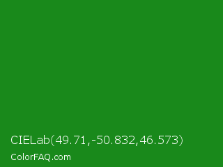 CIELab 49.71,-50.832,46.573 Color is a normal green color and the nearest color is Forest Green #228b22. Hex code #19891b and RGB value is rgb(25,137,27). In RGB color space, this color is composed of 10% red, 54% green, 11% blue, In CMYK color space, this color is composed of 82% cyan, 0% magenta, 80% yellow , 46% black , In HSL color space, this color has a hue angle of 121° , 69% saturation and 32% lightness.