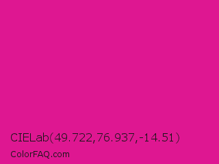 CIELab 49.722,76.937,-14.51 Color is a normal magenta color and the nearest color is Barbie Pink #e0218a. Hex code #de1791 and RGB value is rgb(222,23,145). In RGB color space, this color is composed of 87% red, 9% green, 57% blue, In CMYK color space, this color is composed of 0% cyan, 90% magenta, 35% yellow , 13% black , In HSL color space, this color has a hue angle of 323° , 81% saturation and 48% lightness.